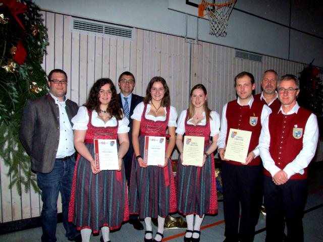 Alle Jahre wieder gehören zum Jahreskonzert des Musikvereins Ehrungen verdienter Musikanten und Mitglieder. Dazu war vom Bezirk 15 im Allgäu-Schwäbischen Musikbund (ASM) dessen stellvertretender Vorsitzender Steffen Kraus gekommen und dazu Horgaus Bürgermeister Thomas Hafner. Aus ihren Händen empfingen die Tenorhornistinnen Theresa Steppich und Nadja Weishaupt eine Urkunde und Blumen für das erfolgreiche Bestehen der D2-Bläserprüfung. Ausgezeichnet wurden auch Flötistin Marina Vogg, die seit zehn Jahren im Verein musiziert, sowie Maximilian Holland, der dem Orchester seit 15 Jahren angehört, wo er unter anderem die Tuba bläst, singt und das Amt des Vorsitzenden bekleidet.